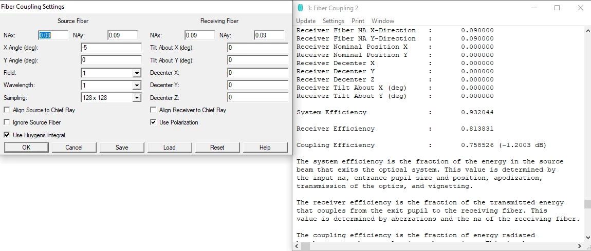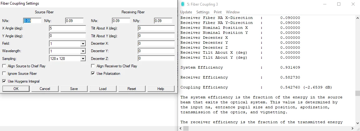 Secondly, I wanted to tolerance the system and therefore look at the effects of source fiber tilts/decenters and receiving fiber tilts/decenters. The POP allows me to just put the source fiber decenter using the Beam data tab. where the input beam is decentered but doesnt allow me to tilt the source fiber. Therefore I go to FICL to do that, although the fiber tilt of eg:+5° is much different from what i get at -5°. shown in the pictures attached. Since the system is having cylindrical symmetry, why do I see a change there, could anyone explain that ? For the receiving fiber however, it shows the same values for corresponding negative value of the tilt or decenter, no matter you use FICL or POP. Also for the source fiber decenteres the efficiency values are the same for corresponding -ve values of decenters. Could someone please have a look and help me out in understanding this ?
