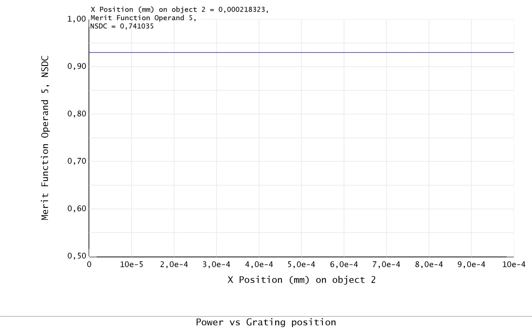 In the layout (see the image), the grating is moved parallel the light source. The defined diffraction orders of the grating are +1 and -1. By recombining the diffracted light, I would expect intensity change due to interference as a function of a gratings position. However, this is not the case, and the intensity remains constant (see the graph).