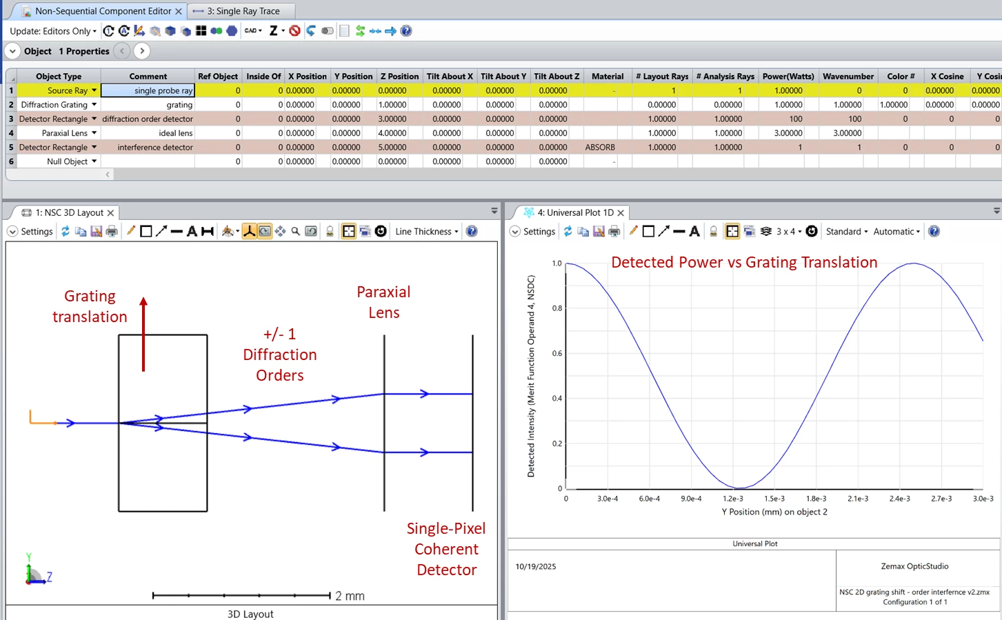 In the layout (see the image), the grating is moved parallel the light source. The defined diffraction orders of the grating are +1 and -1. By recombining the diffracted light, I would expect intensity change due to interference as a function of a gratings position. However, this is not the case, and the intensity remains constant (see the graph).