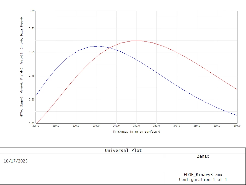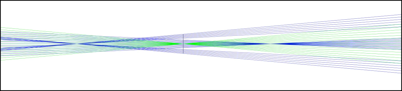 - Blue rays show the multi-focal design, optimized for object distances of ±25 mm from the nominal.