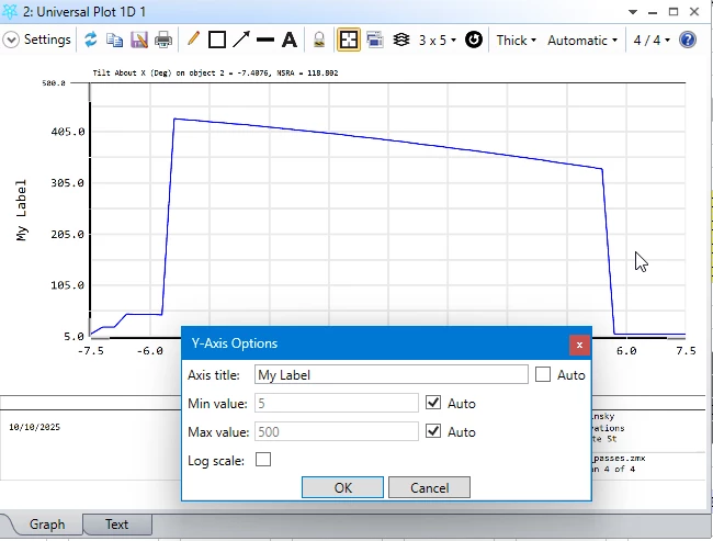 The Universal Plot itself is a very simple tool that was primarily designed for investigative purposes and to fill in some of the gaps of the built-in analysis. Since OpticStudio itself isn’t a plotting or graphing program, I fear that the built-in graphing options will never be as good as a dedicated graphing software.