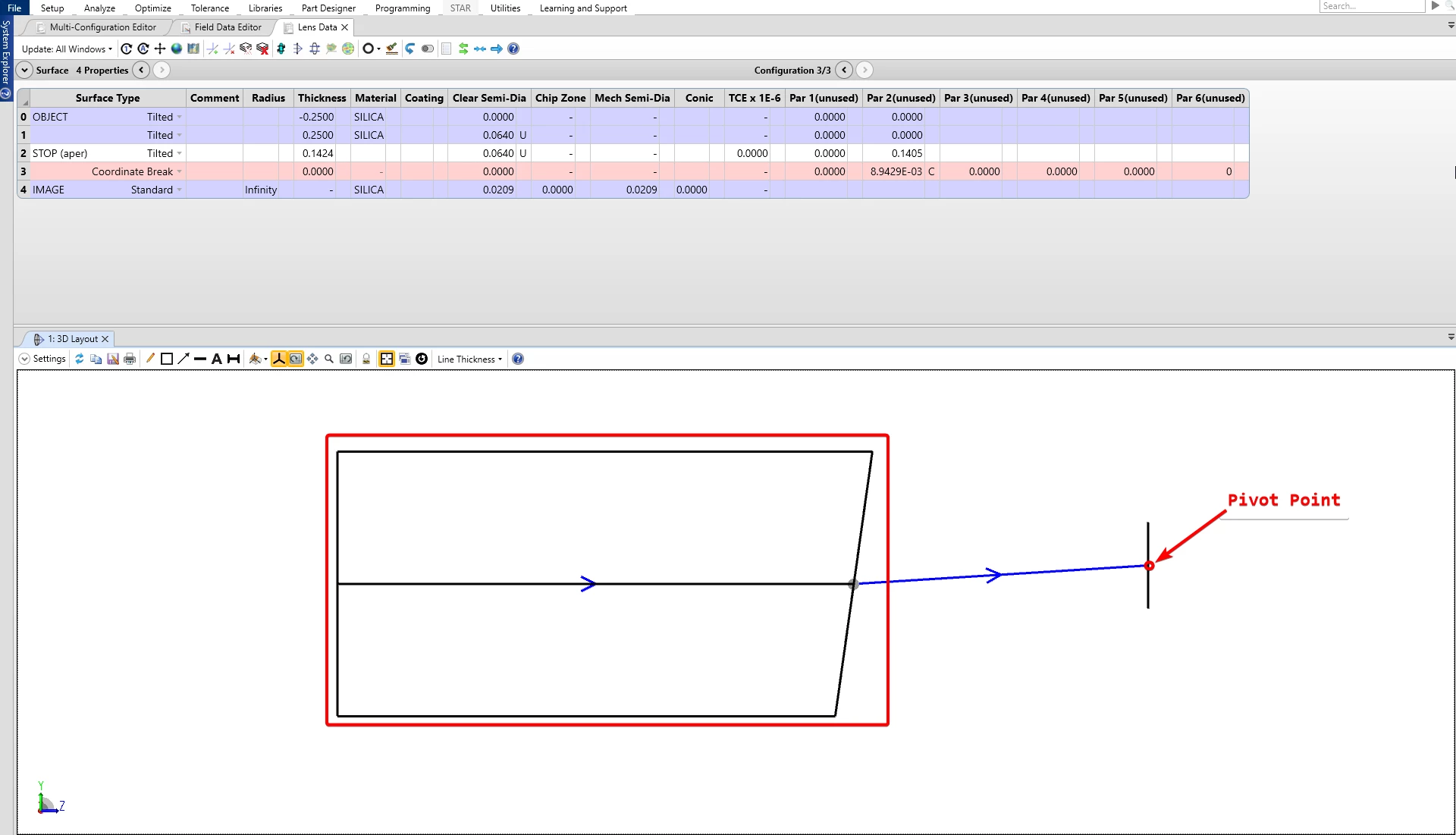 Here is a an example showing a simple Optic Fiber with Chief ray centered on to Image surface. How can I pivot Surfaces 1→3 about the Pivot point centered on the Image surface?