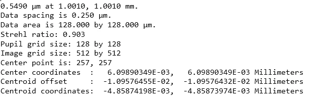 The original post was more about writing your own 2D bilinear interpolation and I should have been more clear when writing the post between “center” and “centroid” since the Huygens PSF Text tab uses both. The coordinate you need to align between different PSF grids is the highlighted value: Center coordinates. And yes, this appears to simply be the Chief Ray coordinate (I only tested on a handful of “well-behaved” files, but you should verify the REAX/REAY operands match up with the Center coordinate for your system).