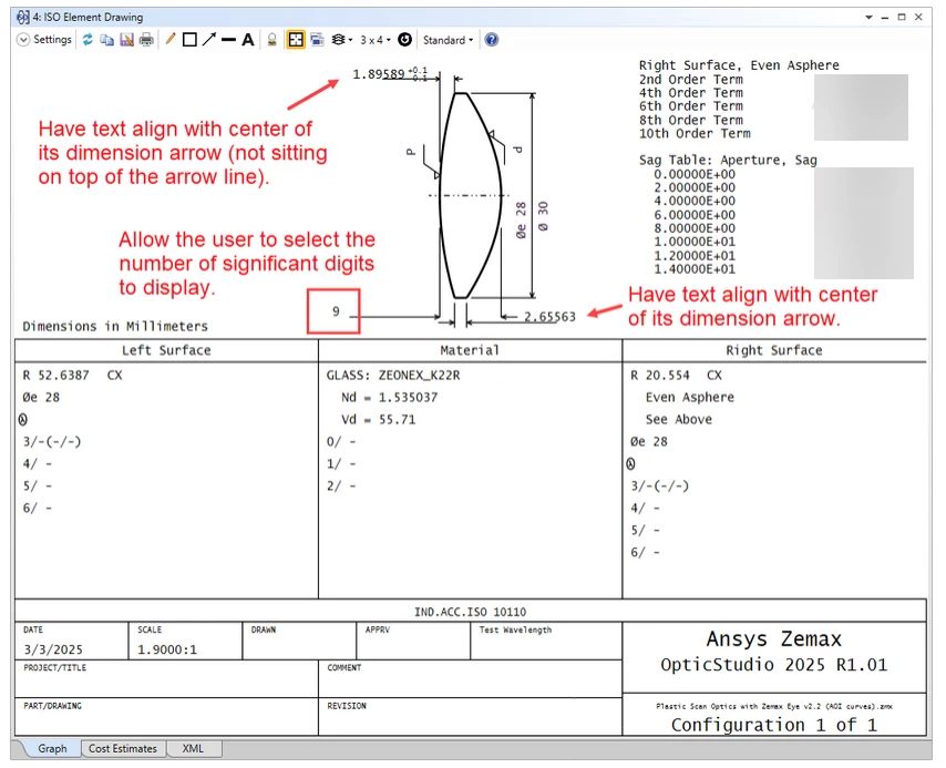 As far as I can tell, the ISO drawing tool in the 2025 R2 release only had a bare minimum update -- namely fixing the errors associated with surface sag and edge thickness. All of the other suggestions have essentially been neglected. OpticStudio is a nice tool for designing custom lenses, but unfortunately very little effort has been expended in providing a more capable ISO drawing tool to have the lenses fabricated.