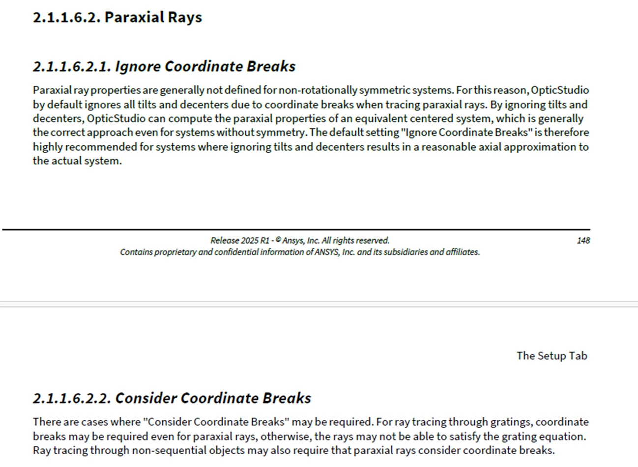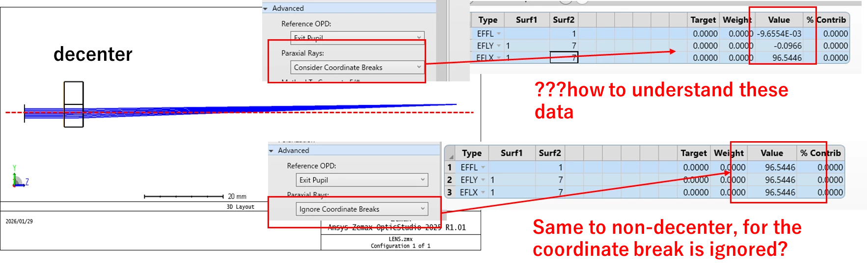 My current understanding is that, since the system is non‑paraxial, even the “paraxial rays” need to go through the coordinate breaks. I tried this approach and obtained the results shown below. However, I am having difficulty interpreting them.