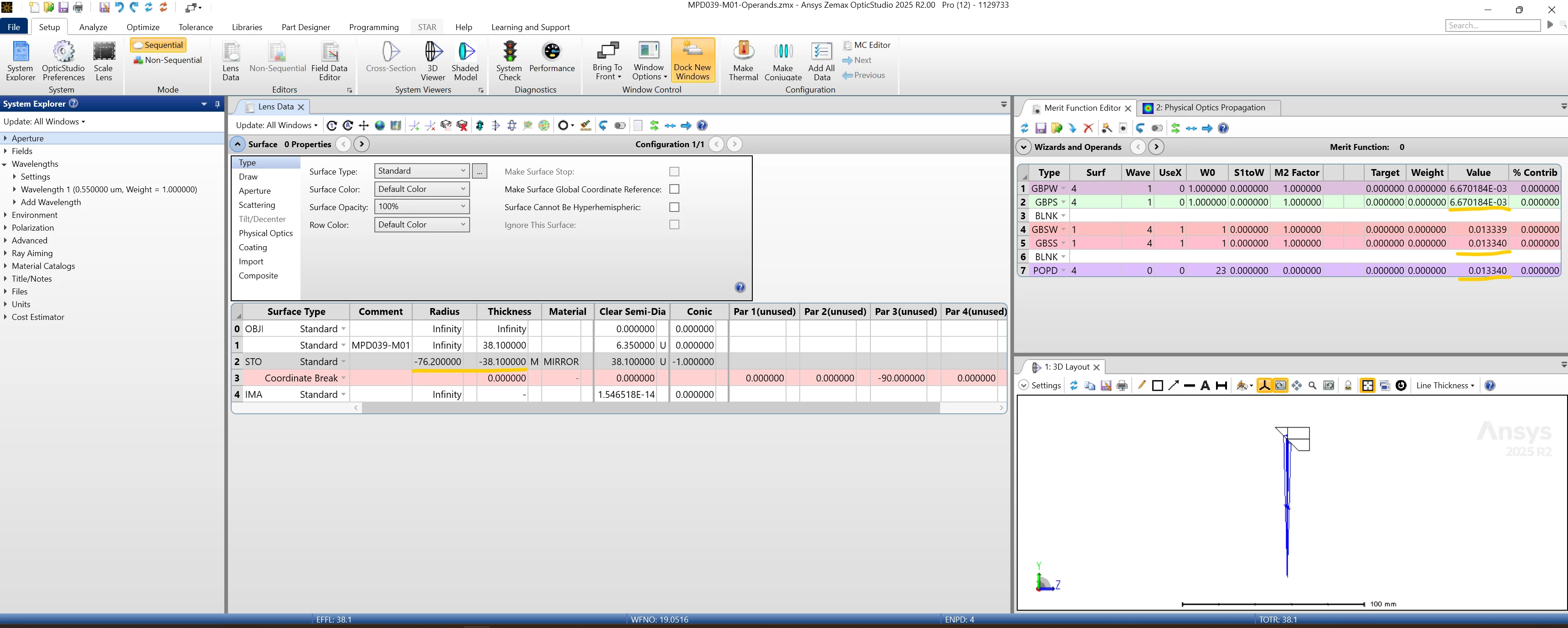 I’m working on a design which use the OAP to focus collimated beam into a SM fiber. In sequential mode, I want to check the focusing Gaussian beam size on the fiber tip, by using GBPS operand. (the collimated beam is generated by fiber + collimator combination, where the collimator is a vendor blackbox. So GBSS and POPD are not working in my real design).
