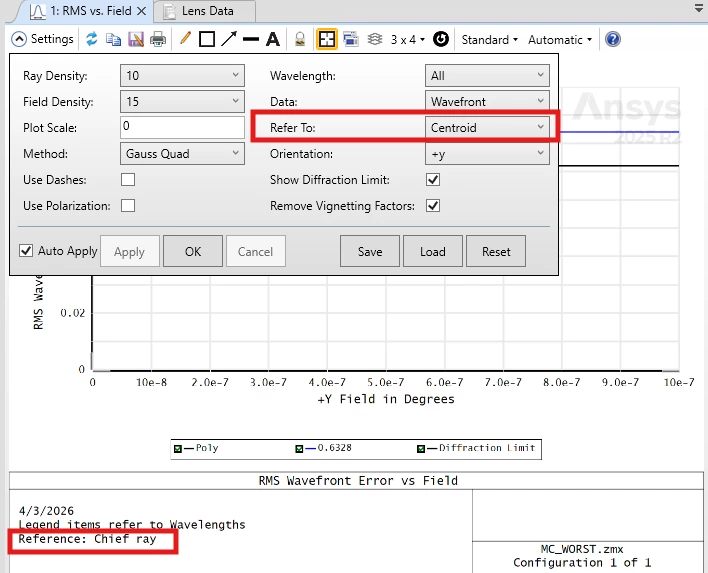 Next, on a whim, I evaluated the RWCH (chief ray reference) operand and noticed it did match the plot value, which I found odd, because the default for the plot is to reference the centroid. Looking closer at the plot, I noticed that although Centroid is selected as the reference in the settings, the title block reports “Reference: Chief Ray”. Likewise, when Chief Ray is selected in the settings, the plot shows “Reference: Centroid”.
