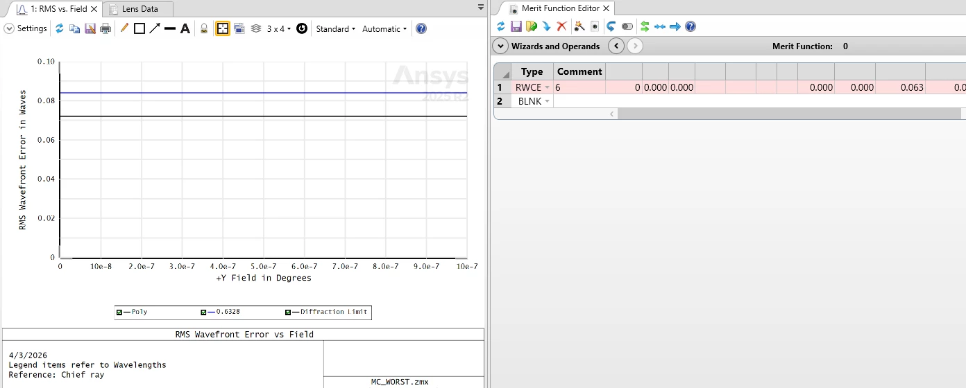 I was working through some analysis and noticed a discrepancy in the RMS wavefront error values reported on the plot vs evaluation in the merit function. As seen in the example below, the merit function operand RWCE was reporting a fairly different value compared to the plot. Initially I assumed this was due to sampling, but the difference persisted (I also tried comparing rectangular array vs Gaussian quadrature).