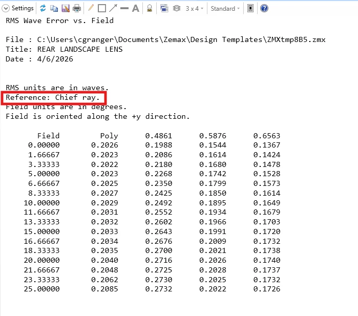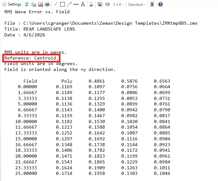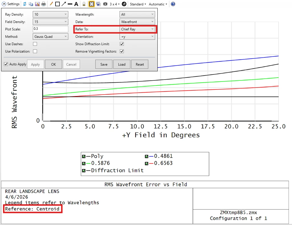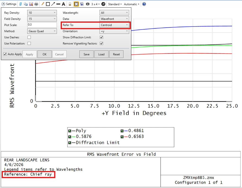 Next, on a whim, I evaluated the RWCH (chief ray reference) operand and noticed it did match the plot value, which I found odd, because the default for the plot is to reference the centroid. Looking closer at the plot, I noticed that although Centroid is selected as the reference in the settings, the title block reports “Reference: Chief Ray”. Likewise, when Chief Ray is selected in the settings, the plot shows “Reference: Centroid”.