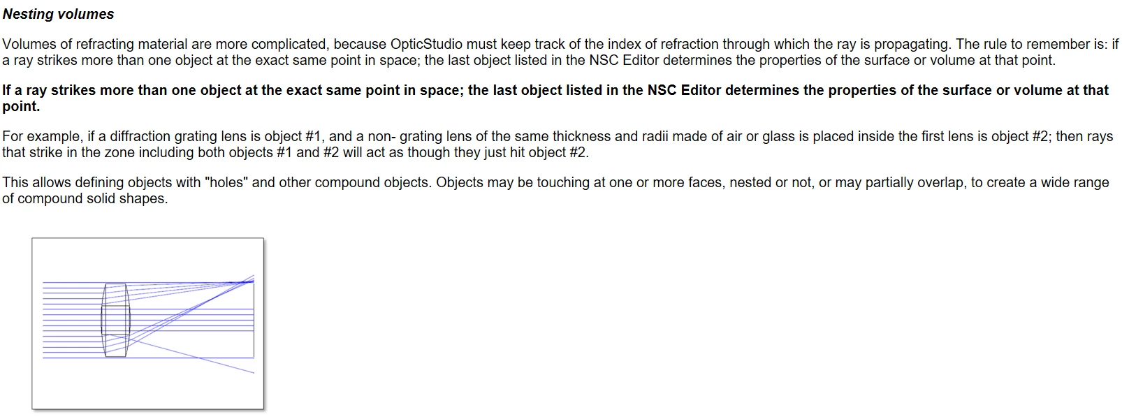 Thanks for your quick response. However, I am still puzzled how I set up in non-sequential for example an underwater objective, where all the lenses are inside a tube (filled with air) but with the front surface of the front lens touching water. It seems to me that I would need a convoluted volume, whose one surface follows the front surface of that lens.