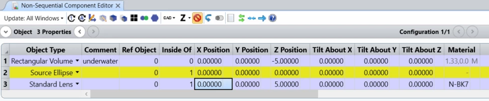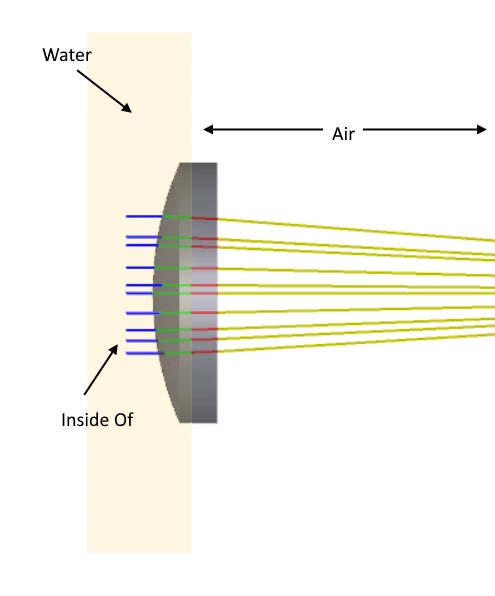 Please refer to the Inside Of column for both your source and your optics. Place your “underwater environment” as a large Rectangular Volume as the first object. Then, all your subsequent components should be Inside Of Object 1. You can change Object 1’s material to the index for your underwater system (fresh water vs salt water):